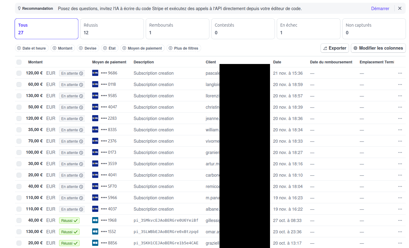 On n’a pas du tout fait de formation sur la caisse. Ça peut être une solution ponctuelle pour rattraper une erreur, mais pas une pratique standard. @SylvieM Pour le dire autrement Stripe n’a pas reçu l’information de la banque de Marie comme quoi le prélèment a été fait. Si les délais sont si longs, ça va être un problème.