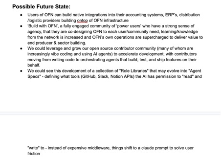 In my view (and @maikel please push back on this, as you like) the above process is evidence that Greg (not a developer but a seasoned product owner, with technical skill) is actively helping OFN develop some best practices in the use of AI agents, and that that work is already bearing some initial fruit. Early days, but I think we can see a process of slow but steady improvement taking place (and everyone can assess this for themselves by following Greg’s commits on github -gbathree). And i think this suggests we should continue a methodical, time bounded exploration of this space.