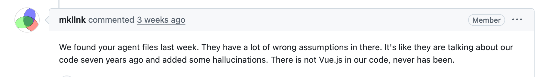 Currently, I think the most in-depth discussion of how we can evolve a really robust and useful community practice around the training of AI coding agents is currently taking place on github, around the need for well developed Agent.MD files - a convo to which Maikel has been actively contributing (thank you Maikel!):