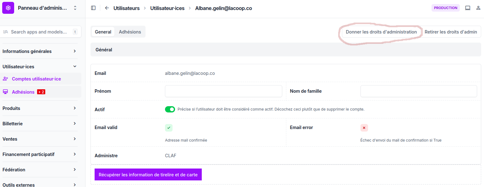 Ensuite, avec son adresse d’administration, il va dans ‘Comptes utilisateurices’ et il donne les droits admin au nouvel utilisateur, qui pourra maintenant générer des paiements :