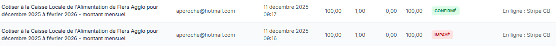 En plus du fait que nous ne pouvons pas supprimer de ligne utilisateur, lorsqu’un paiement passe (cf photo), 2 lignes apparaissent : 1 impayé et 1 confirmé. Est ce normal ? Est ce que cela peut-être épuré ?